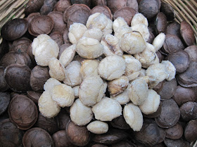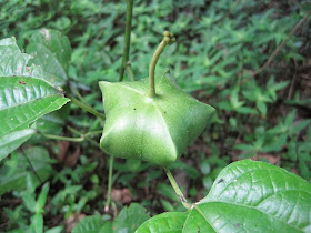Sacha Inchi is one of those magical plants straight out of a fairy tale. A briarless briar that will up and over everything in a matter of months, burying shrubs, trees, castles beneath its vibrant green flow of leaves and vines. The flowers are like little lances, tiny white yellow balls on a small sturdy stalk - you can see the remnants in the first photo. One would never think that a little slender stick would become such a Cinderella's carriage of a fruit. The fruit is star shaped and can have between 4 and 7 points (though I'm sure there are 3 pointers and 8 pointers out there), though we see mostly 5 and 6 pointed fruits. Star shaped fruits are always magical in their symmetry and simplicity, and the sacha inch has to be one of the most beautiful.