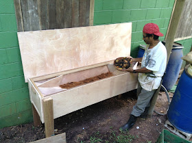 So I re-did the bins. The plastic bins were good enough, and I'm still using a scaled down version of the most simple, but I felt I was ready to go 'large'. We built this bin with plans from Northwest Worms, and while I don't think the plywood will last a long time, it's a good prototype to work from. What we use in the bins is just too wet I think and will eventually rot the plywood out. But I like the design, and so far it's working well. We put about 3 inches of coconut fiber as substrate, but now I'm changing it out gradually with more textured / chunkier pieces of coconut husk chips. Again our mix is wet and the coir is packing down more than I'd like.