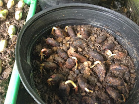 Here are the seedlings potted up, developing quite nicely: you can see the remnants of the opened seed about 3 inches up from the soil. We will give these another month or so under the shade cloth before we plant them out or graft them.